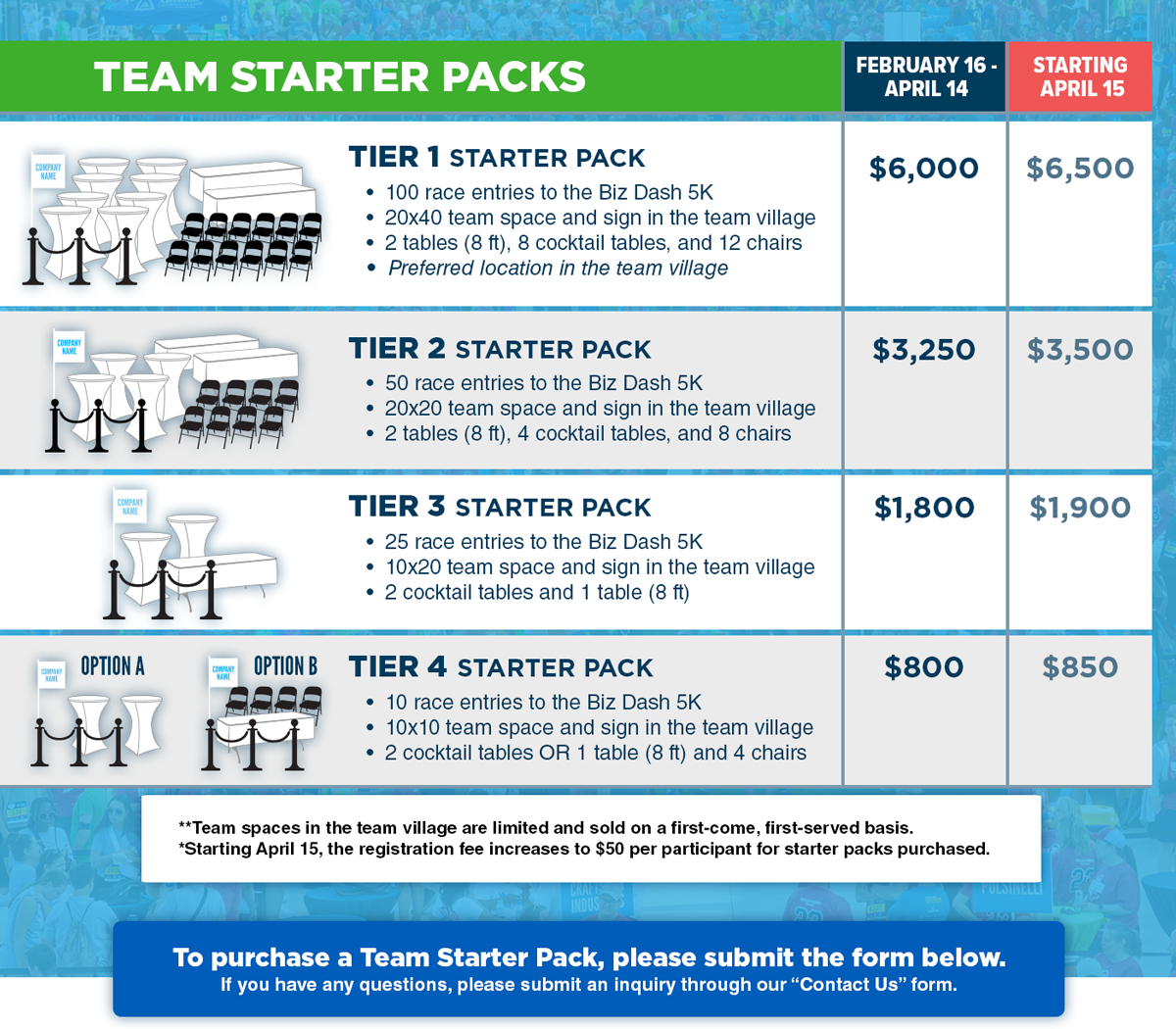 - A team starter pack does not equal a sponsorship. If you’d like to become an official sponsor of the Biz Dash, please contact us through the Contact form and let us know!